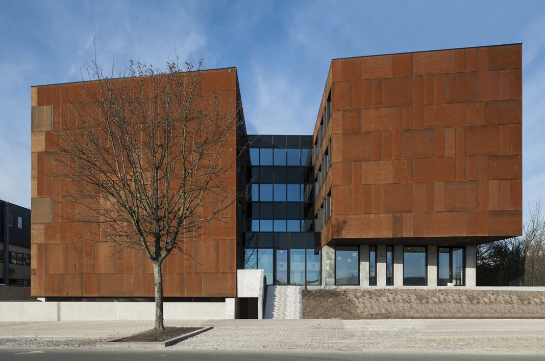 L’option pour le matériau de la façade est un élément essentiel de ce projet. Les grands volumes de construction ont été totalement revêtus d’un platelage en acier résistant aux intempéries (« corten ») qui non seulement confère à l’ensemble un caractère industriel, mais d’où émanent également spécificité et chaleur. Outre son aspect naturel avec une couleur, une texture et différenciation prononcées, il permet de grandes économies d’énergie au niveau des frais d’exploitation. L’acier résistant aux intempéries est totalement exempt d’entretien.