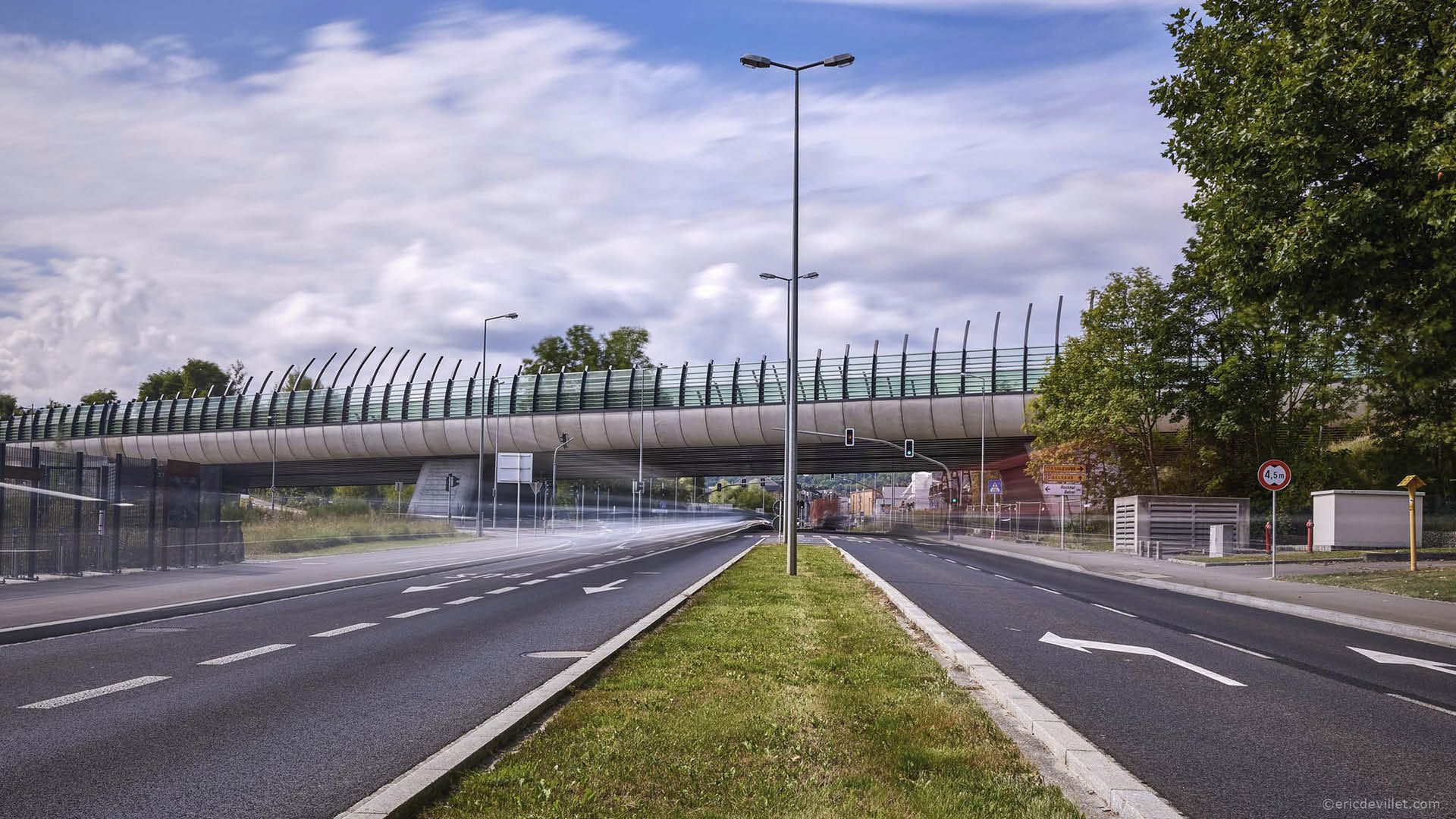 Le tablier du pont en acier-béton est prolongé en hauteur par une structure supérieure en acier composée d'une série d'arcs de différentes hauteurs qui supportent l'écran acoustique. Cette structure donne du rythme et du mouvement à l'itinéraire.