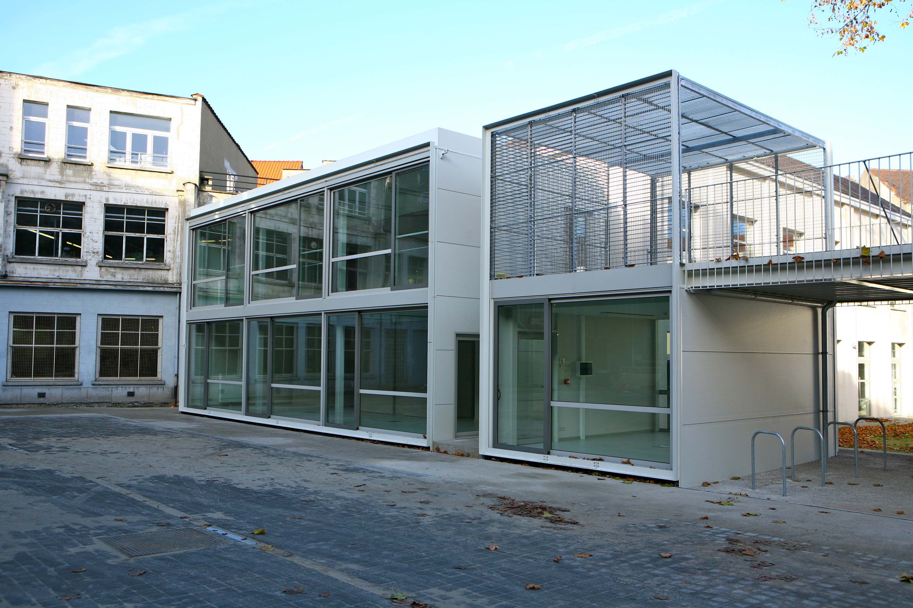 La commune de Molenbeek a pris l’initiative de réhabiliter d'anciens bâtiments en ateliers d’artistes et en bibliothèque. Le bâtiment existant accueillera des ateliers d’artistes et une bibliothèque. Un second bâtiment existant sera transformé en halle extérieure, seule la façade en brique d’origine est conservée. L'ajout d’un troisième bâtiment offre des locaux complémentaires. L’emploi de la structure métallique est décliné de quatre manières différentes et répond aux nécessités propres à chaque bâtiment : une structure en acier pour l’ossature du nouveau bâtiment, une charpente acier en remplacement pour le bâtiment existant, un portique métallique pour le renforcement de la stabilité de la halle couverte. C’est également d’acier que sont constitués les habillages des escaliers et des gardes corps de même que les murs mitoyens. L’intervention architecturale se décline ainsi en trois lieux différents et chacune à son échelle. Les finitions en acier, qu’il soit laqué, galvanisé, industrialisé affinent la réalisation, conférant au projet une homogénéité d’ensemble.