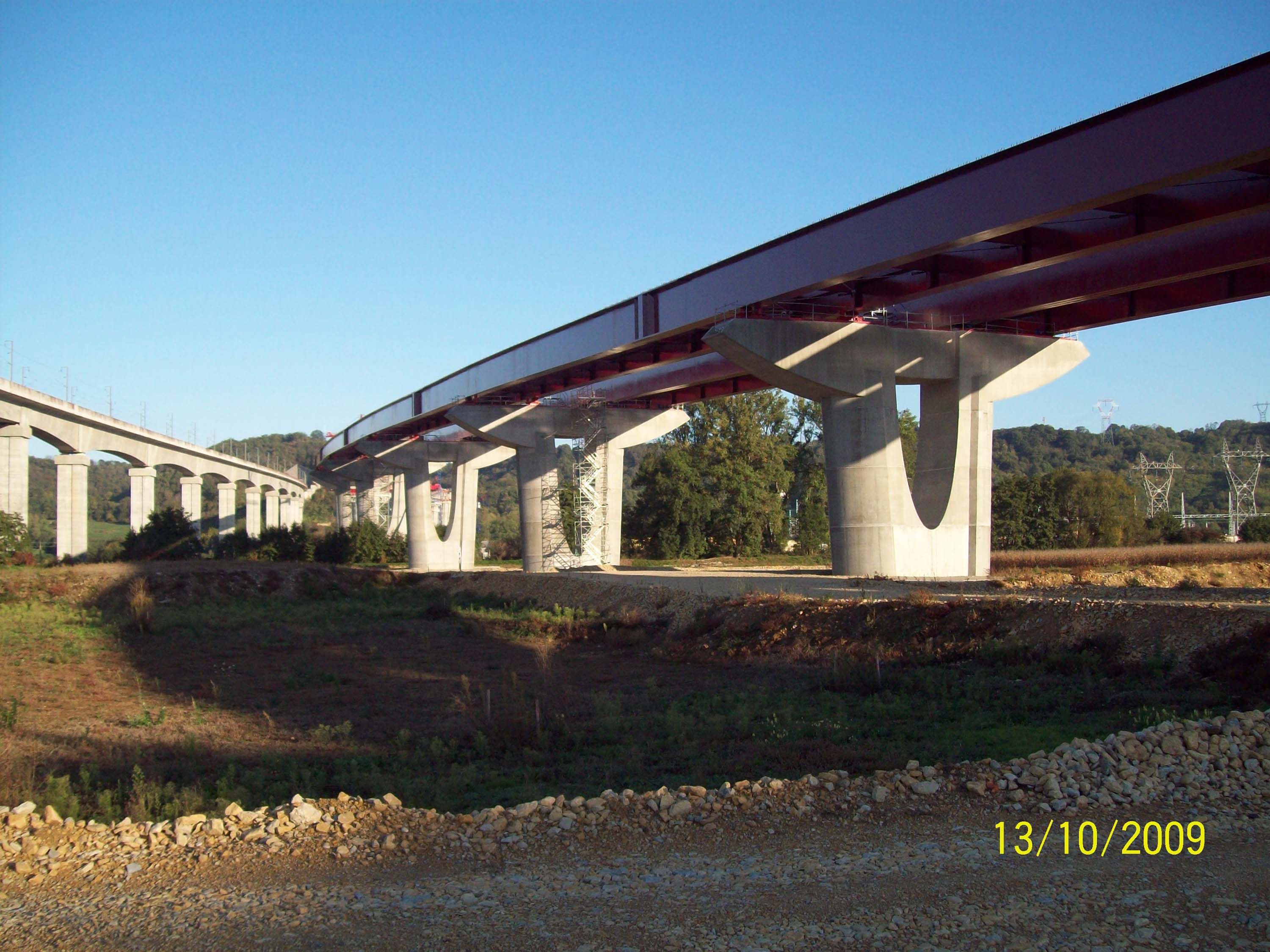 Het viaduct, dat 1.210 m lang is en 30 m breed, beslaat een oppervlakte van 34.000 m2 en overbrugt een hoogteverschil van 50 m. Het bestaat uit twee stalen brugdekken met een gewicht van 4.300 ton, getorst door 15 betonnen pijlers. Aangezien de brug een S-vorm heeft, diende ze vanaf beide uiteinden volgens een cirkel te worden gelanceerd. De voeg tussen beide helften werd achteraf gelast op een hoogte van 40 m.