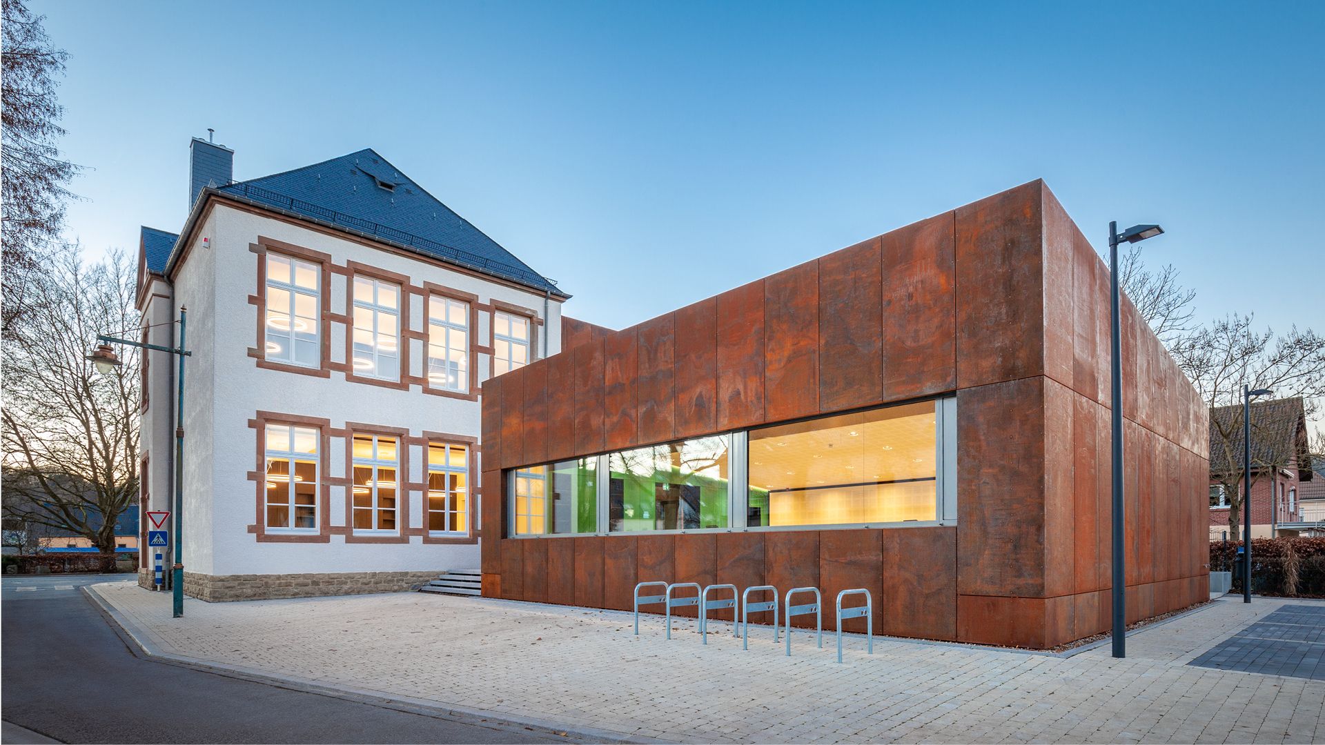 Le projet de rénovation de l’ancienne école à Erpeldange-sur-Sûre, bâtiment communal classé, marie préservation du patrimoine et architecture contemporaine. Une annexe des années 1950 a été démolie pour accueillir une extension moderne. Le bâtiment ancien, rythmé par des éléments en pierre, dialogue avec une nouvelle aile en acier auto-patinable ('corten') aux volumes découpés, créant un équilibre harmonieux entre les époques. La patine naturelle de l’acier, brute et évolutive, renforce l’ancrage du projet dans son environnement.