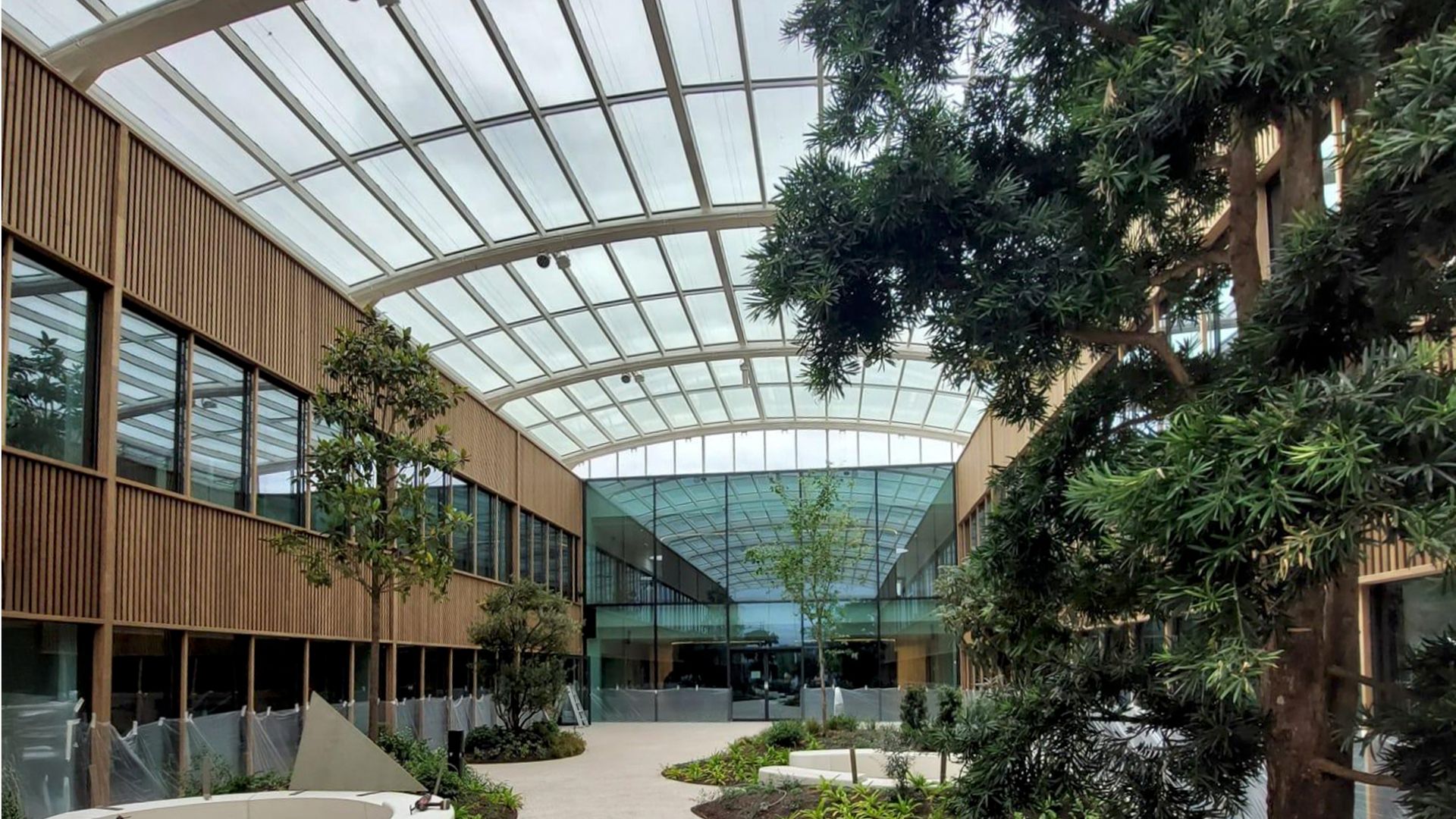 Cette cour ne fait pas partie du « volume protégé » pour le calcul thermique, mais le choix s'est néanmoins porté sur du verre isolant. Un système de ventilation naturelle et des stores intérieurs intégrés devraient assurer un climat intérieur agréable et régulé. Un atrium rectangulaire de 48x12 m a été recouvert d'un toit en verre. Il ne s'agit pas d'une simple verrière d'atrium, mais d'une verrière bioclimatique.