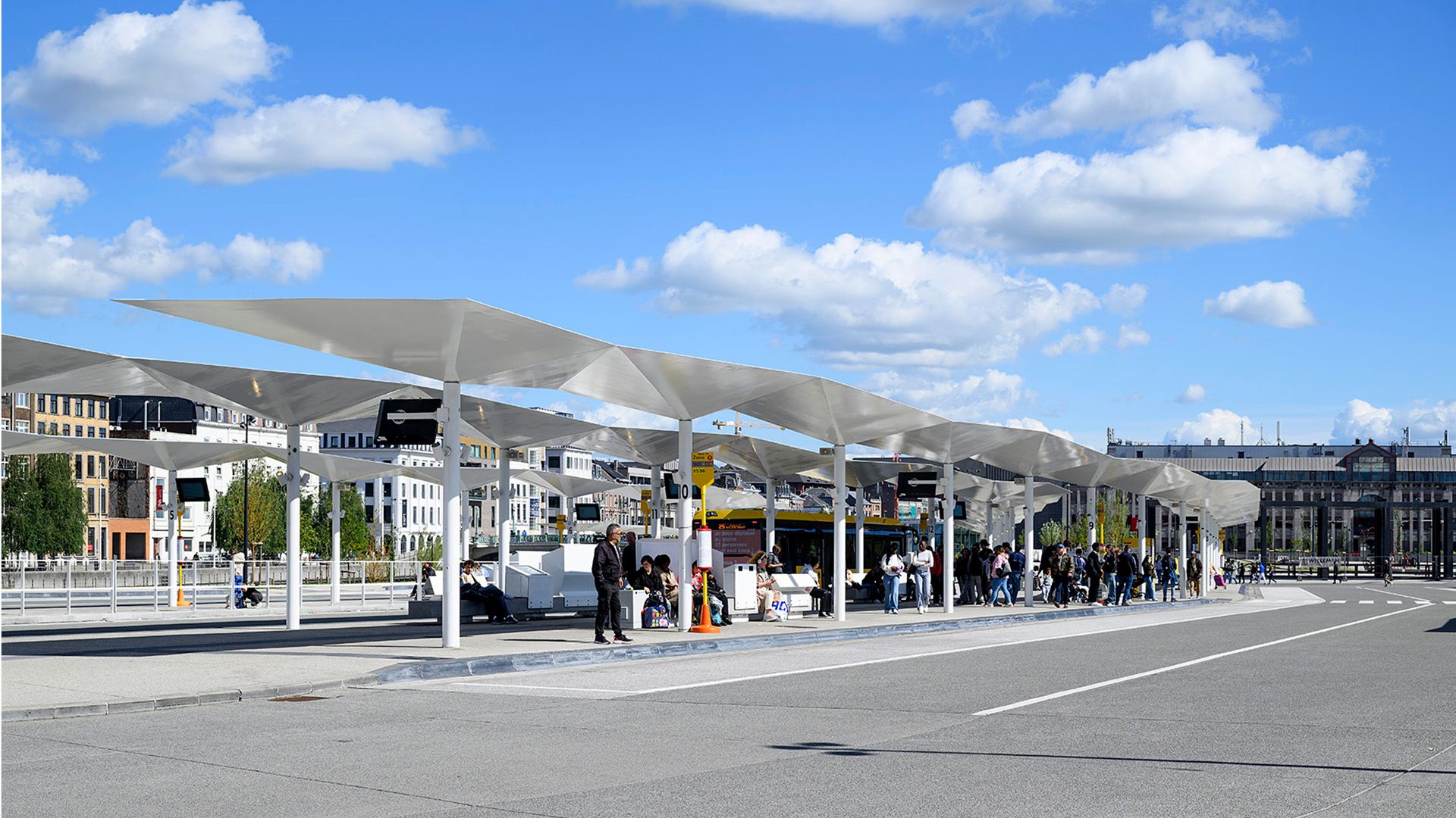 La totalité des quais, tant pour le métro que pour les bus, est recouverte de combinaisons linéaires d’auvents de protection métalliques, posés sur de fins poteaux cylindriques et dont les minces tôles de couverture sont assemblées en un origami qui raidit l’ensemble de la structure. Tous les éléments métalliques des auvents, des garde-corps et du mobilier urbain propres aux nouveaux aménagements reçoivent une finition laquée blanche. Celle-ci est brillante en face inférieure des auvents pour refléter l’éclairage indirect des quais.