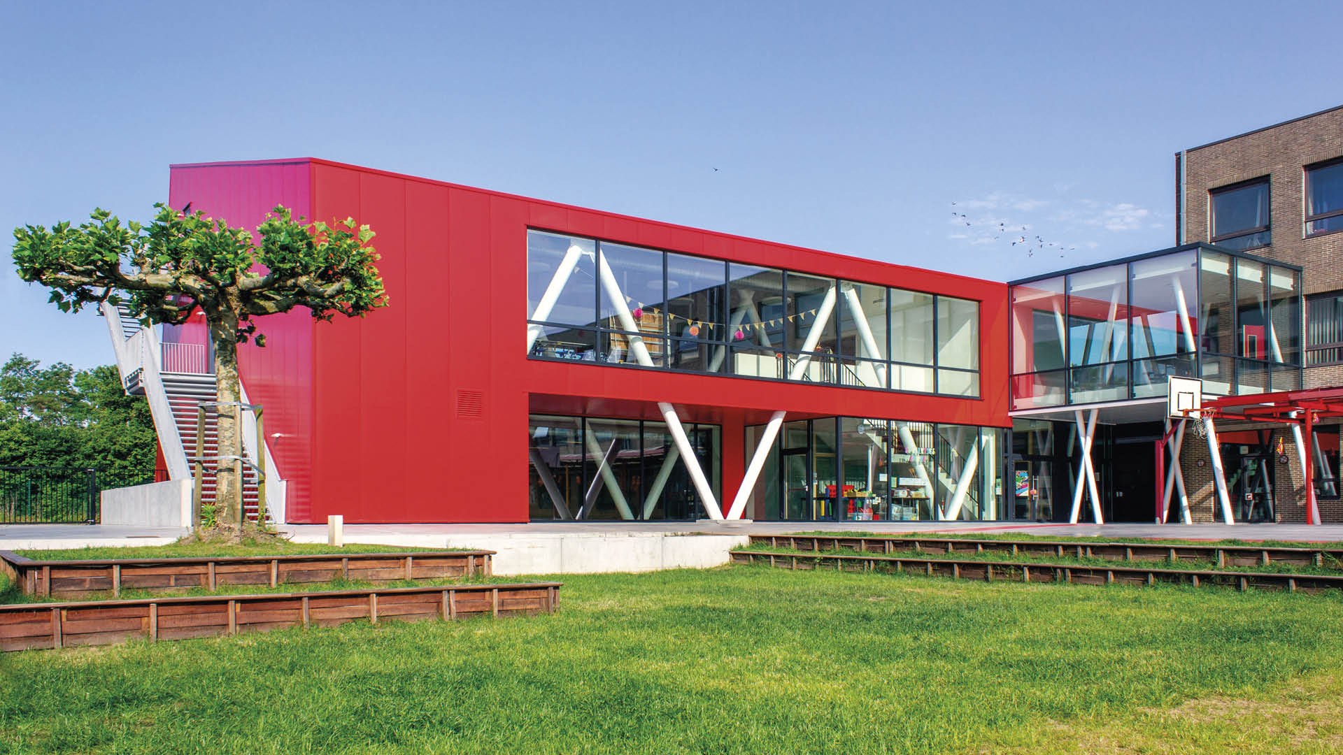 Dankzij de opvallende inplanting langs de straat, de felrode tint is het gebouw dé blikvanger van de buurt.