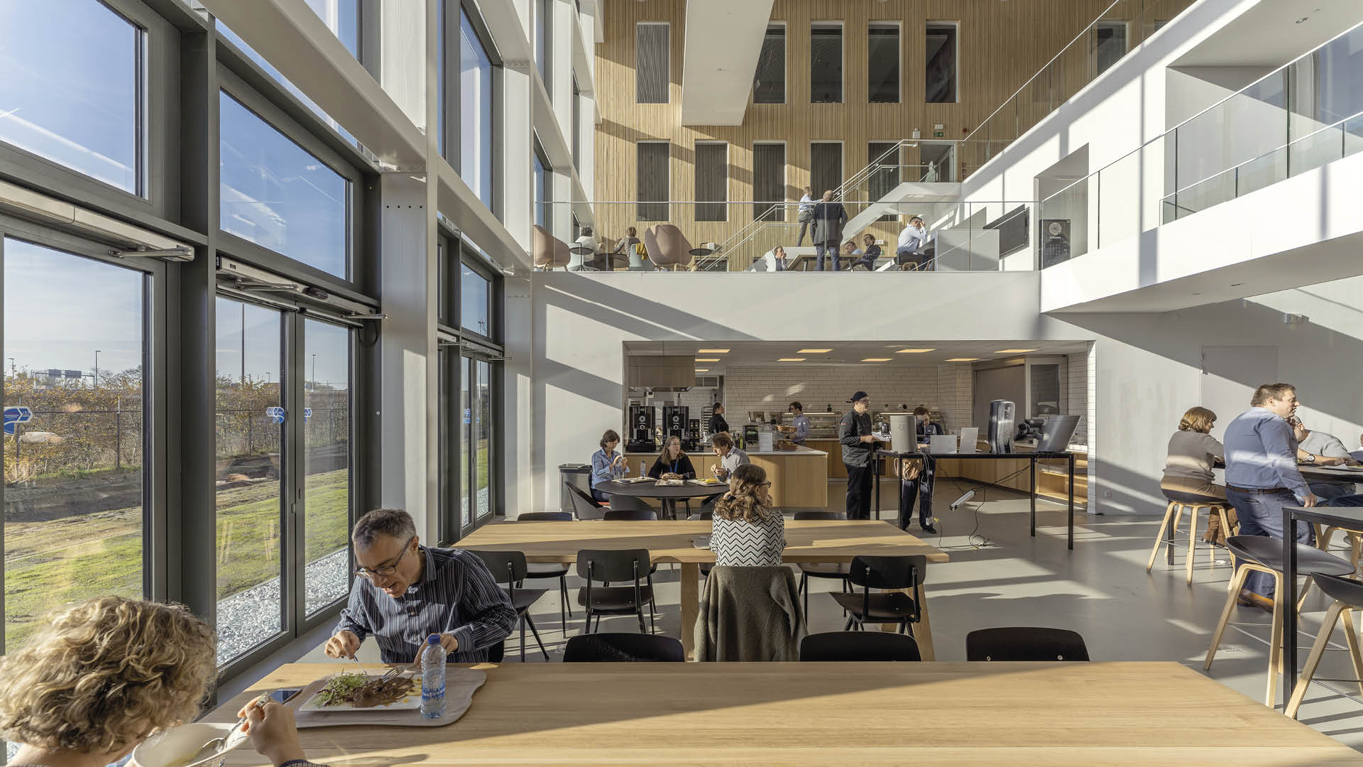 Het nieuwe ‘Food Experience Centre’ biedt in het hart van het gebouw een representatief en uitnodigend atrium. De visuele verbindingen tussen de kantoorniveaus en het atrium zorgen voor een levendige interactie tussen de verschillende functies. Vier passerelles in staal maken de verbinding tussen de oost- en westgevel.