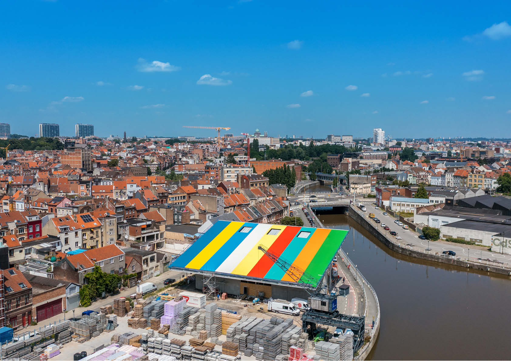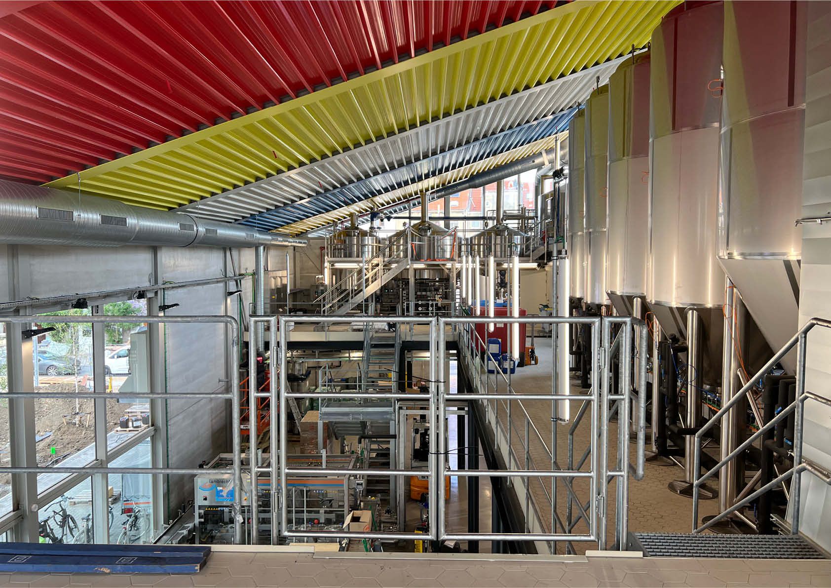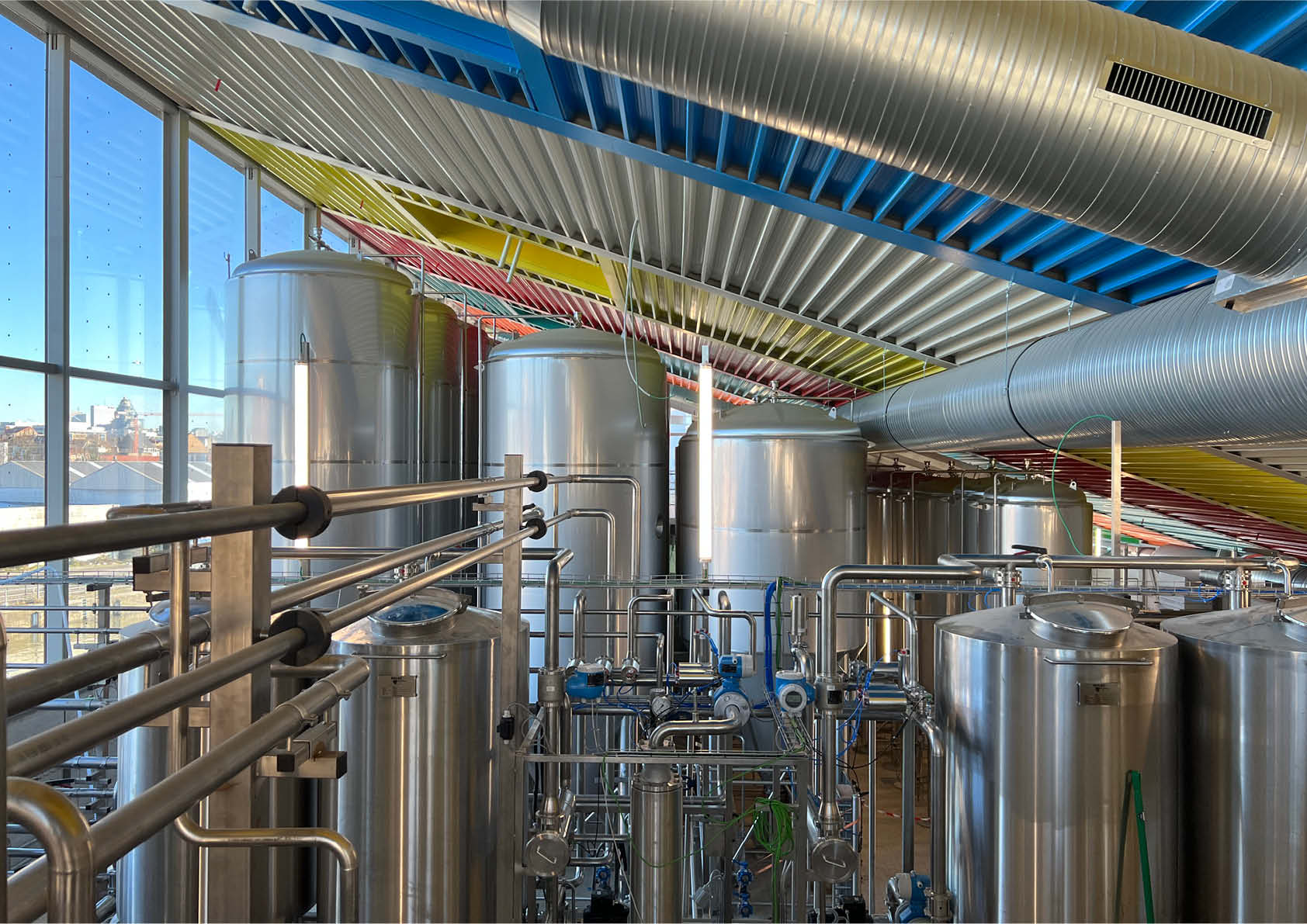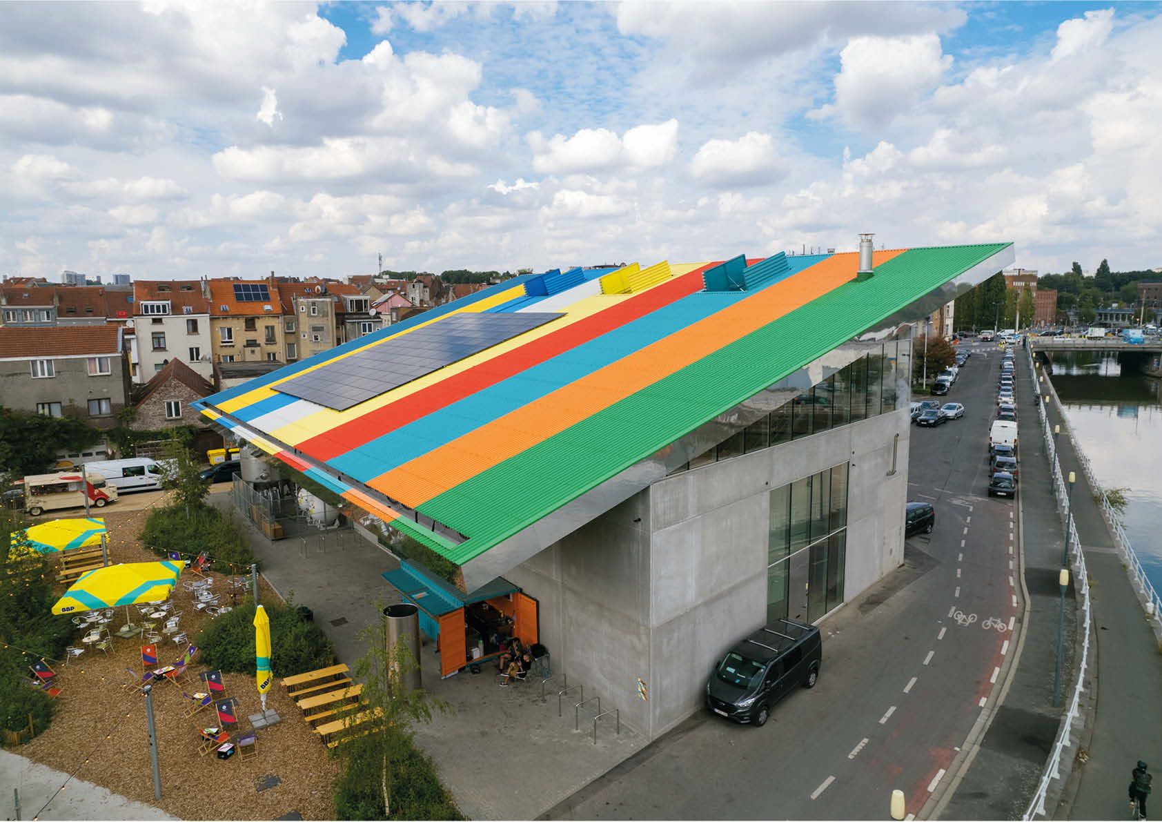 Dat blijkt ook uit hun nieuwe brouwerij in Anderlecht, waar duurzaamheid, functionaliteit en productiviteit de boventoon voeren. Het kleurrijke dak, de esthetische staalstructuur, de open indeling en de zichtbare brouwinstallatie maken er een uniek gebouw van dat de Brusselse kanaalzone een nieuw elan geeft. Het compacte, efficiënte volume is opgevat als een ‘uitgepuurde industriële container’ die een unieke inkijk biedt in het bouwproces. Zo zijn alle silo’s en installaties naadloos geïntegreerd in het gebouw (zonder enige vorm van afscherming).