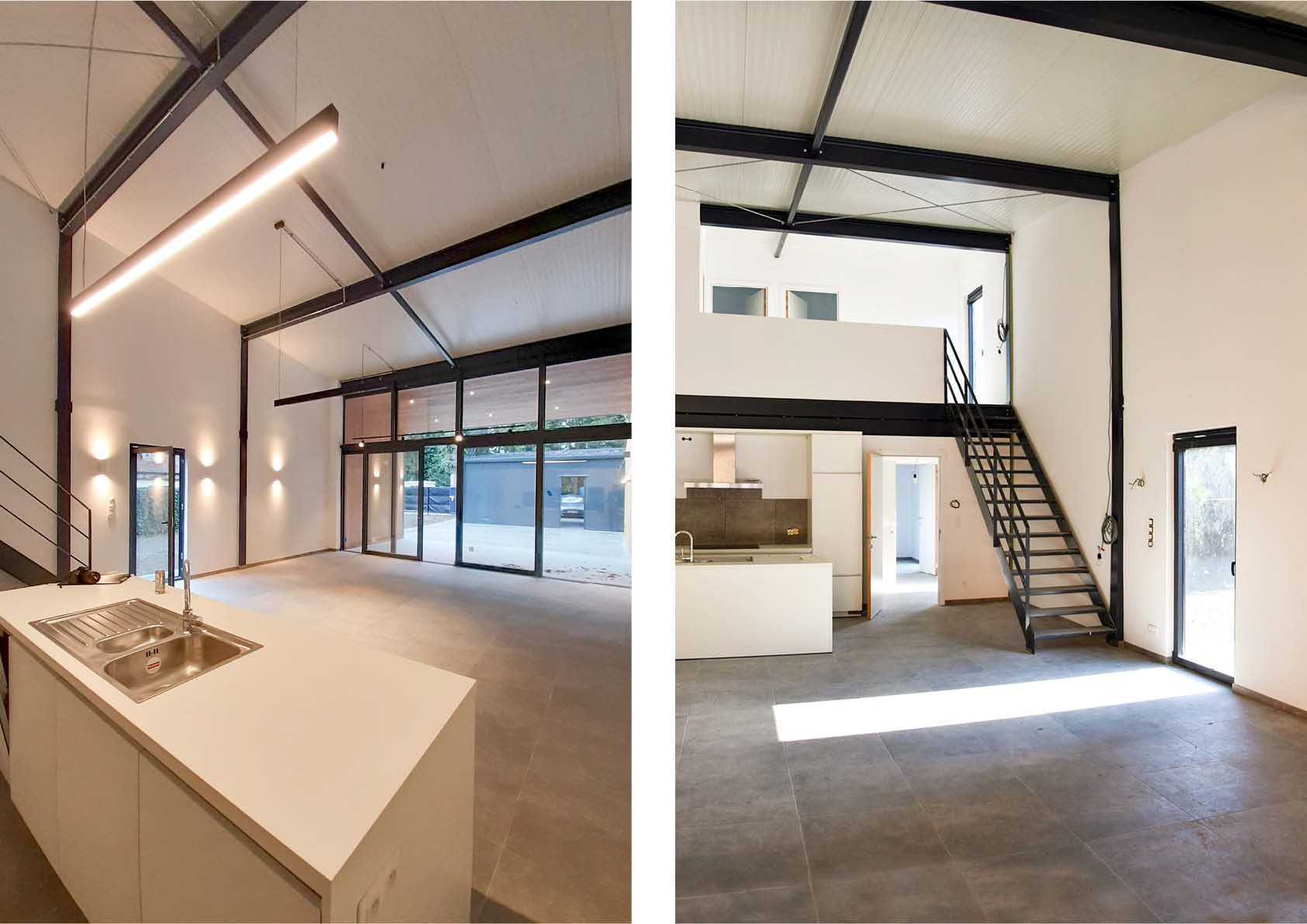 In een groene omgeving in het Belgisch-Nederlandse grensgebied maakte een vervallen woning plaats voor een moderne geïntegreerde tweewoonst. Beide huurwoningen moesten een industriële uitstraling en grote open leefruimtes hebben.