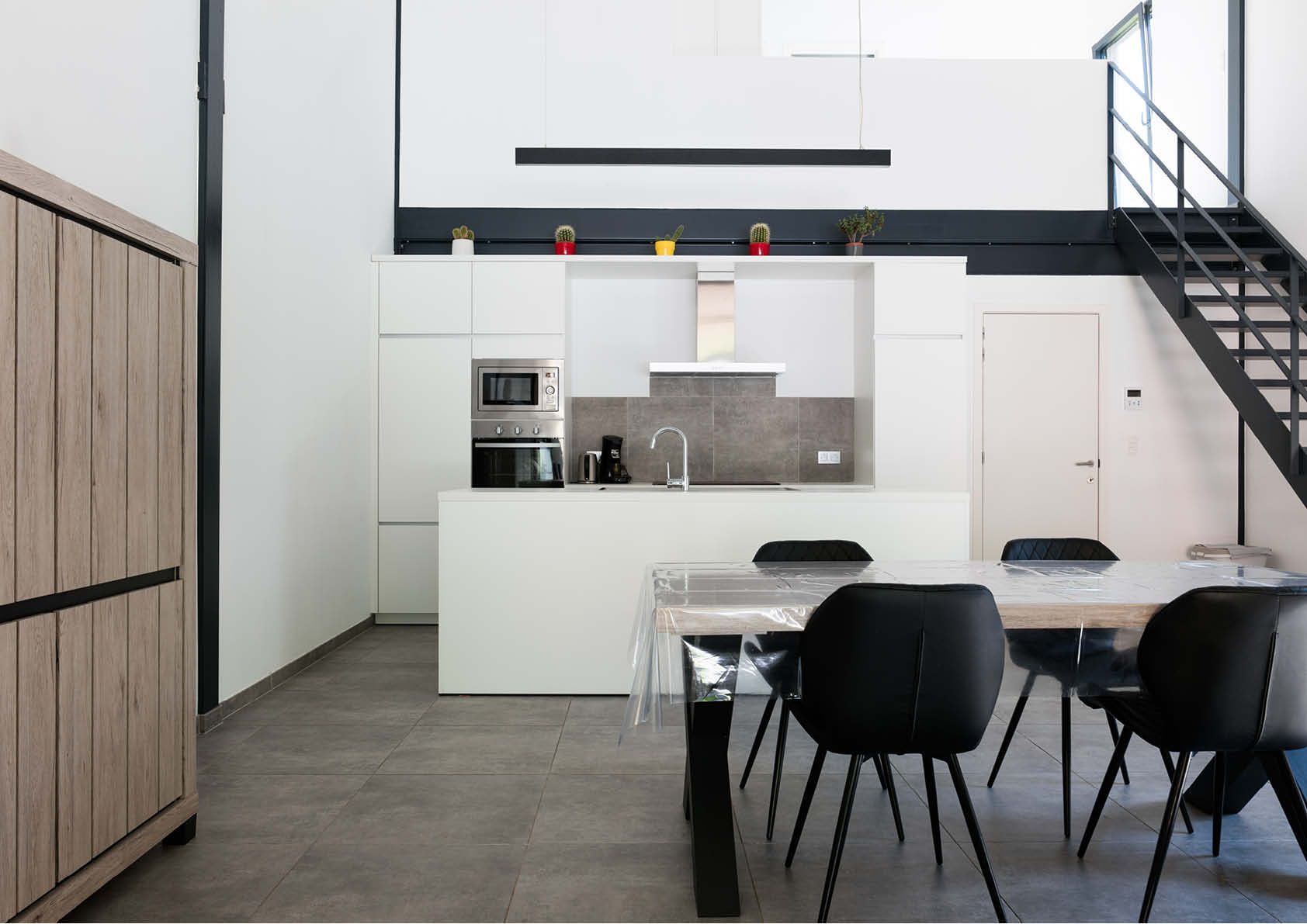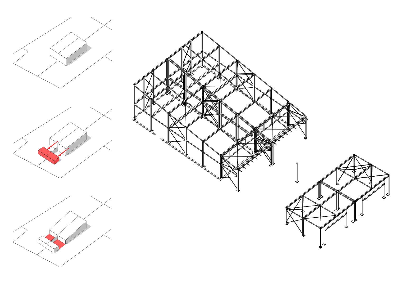 De keuze voor een staalstructuur lag dus voor de hand, ook om de uitvoeringsfase zo kort mogelijk te houden – het volledige bouwproces, van afbraak tot en met interieurafwerking, nam slechts negen maanden in beslag! – en vanwege economische en ecologische redenen (recyclage). Zowel de wanden als het dak zijn integraal bekleed met antracietgrijze industriële sandwichpanelen. De onderkant van de dakoversteken boven de beglaasde kopgevel, die oververhitting vermijden, en de wanden die aansluiten op de terrassen zijn dan weer afgewerkt met hout. Dit zorgt voor een fraai visueel contrast.